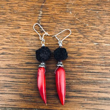 Drop earrings made from flower petal beads, recycled glass beads, wooden beads, or seed beads.
